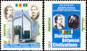 Celebrating 50 years of scaling the K-2 by an Italian expedition in 1954 (above left), Establishment of Cadet College Hasan Abdal in 1954 (above second from left), Winner of Agha Khan Fund for Architecture - The Bhong Mosque in Rahim Yar Khan (above second from right), Commemorative issue of two stamps on the Karakoram Highway (above right) |