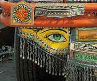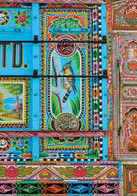 The Bhong Mosque in Rahim Yar Khan boasts an extraordinary modern architecture and interior (winner of the Aga Khan Award for Architecture). It is built in traditional style with extravagant use of gold leaf, mirror work and onyx; it is particularly famous for its stylized Arabic calligraphy. Like Hala in Sind, Multan in Southern Punjab is also famous for its blue pottery, extensive stitch work for women dresses and camel skin lamps, hand loom fabrics. The Balochistan province, specially Quetta, Kharan and Kalat are famous for hand woven carpets, while NWFP, specially Chitral, Abottabad are famous for wool and woolen cloth. Punjab is famous for bed Sheets, Duries and Khes (Gakkhar), pottery (Gujranwala), brass (Lahore), cotton and hand-woven fabrics (Faisalabad), walnut furniture (Chiniot). Another interesting form of very indigenous art is found on buses and trucks in Pakistan, using in numerous colours the road side artists decorate the buses and trucks drawing birds, animals, rural landscapes or even some celebrities.